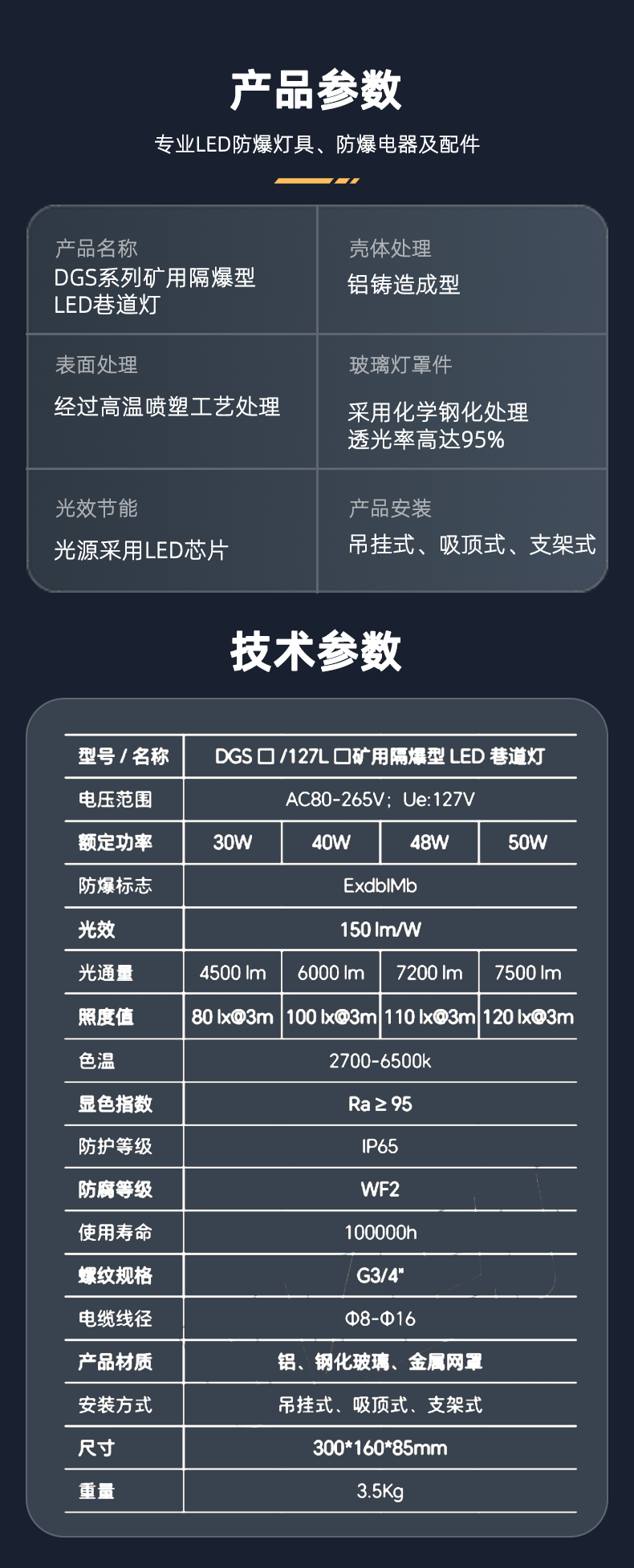 品牌:玮肯防爆 类型:防爆照明灯 加工定制:否 光源类型:LED 光源功率:30/40/48/50 W 电压:80-265 V 防护等级:ip66 主要适用范围:矿用 型号:DGS12/127L 一、适用范围